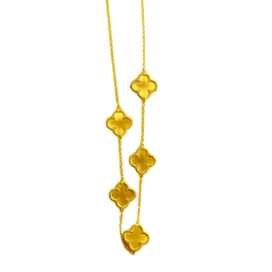 • Long lariat-style necklace adorned with five polished and lustrous four-lobed clover motifs