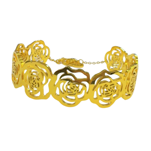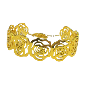 • Cutout/Filigree Design: Features a wide structure composed of a row of interlocking, cutout rose motifs. This design gives the bracelet a light and airy look despite its width